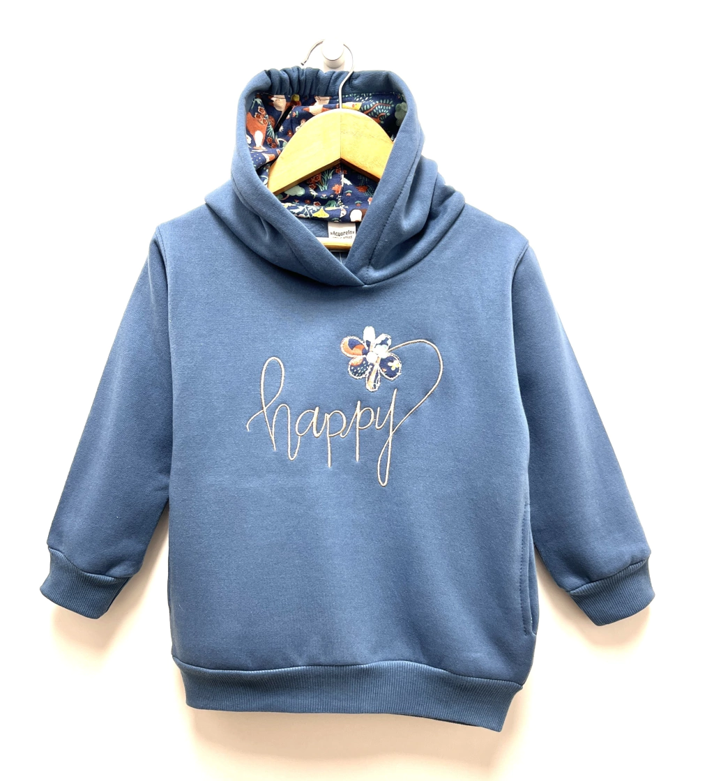 Buzo bordado Happy con capcuha en algodon frizado